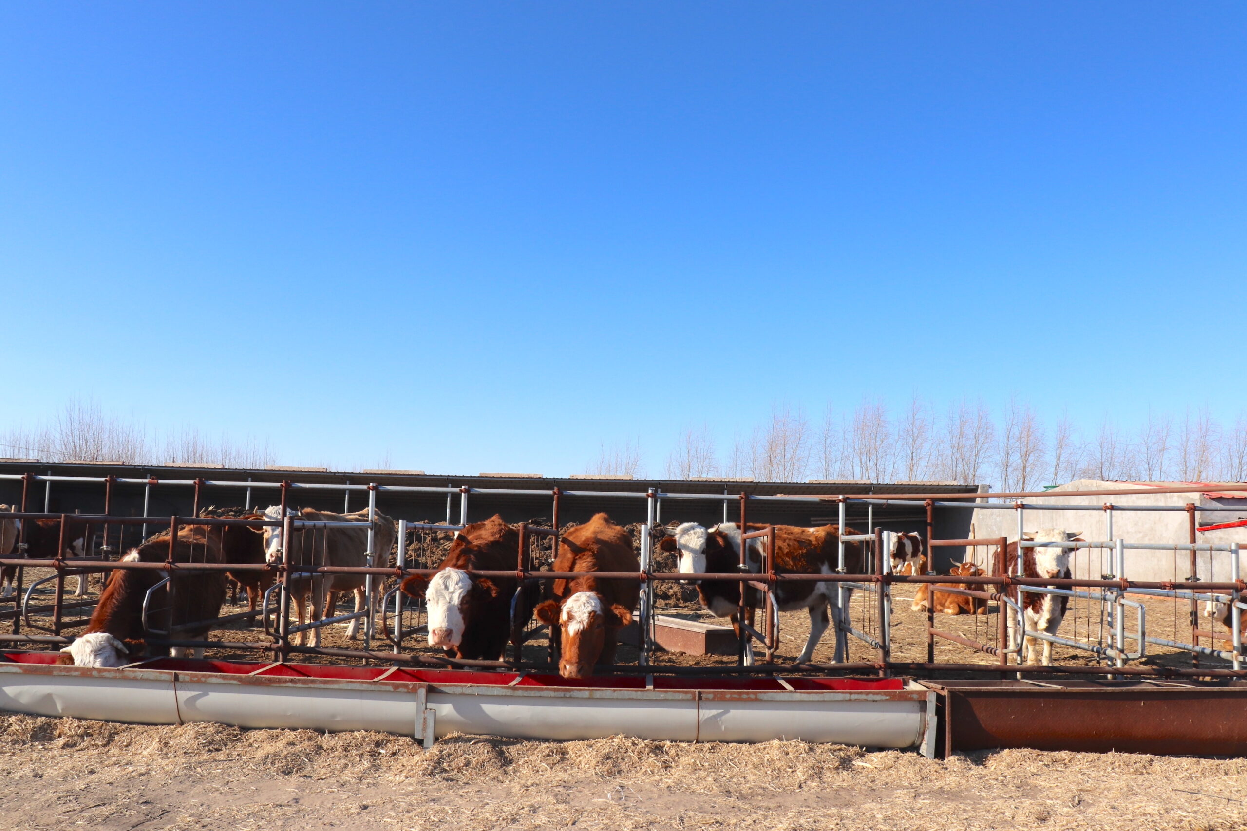 集約的牧畜経営には防寒用の畜舎と給餌槽の整備が欠かせず、1日2回給餌する必要がある。これは大変重労働であるうえに、大きな経済的投資が必要である(内モンゴル自治区通遼市で撮影)。