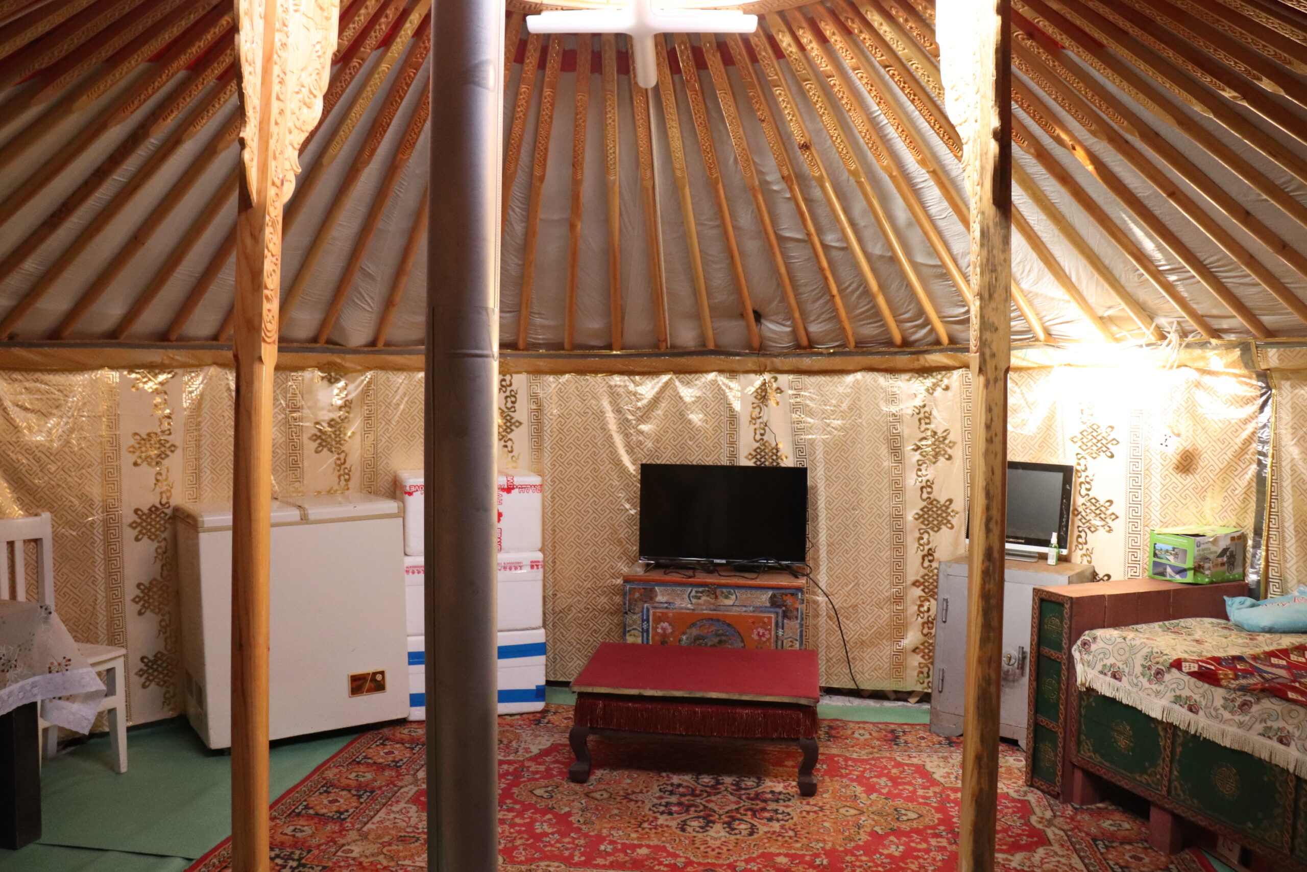 モンゴル遊牧民の伝統的な移動式住居ゲルの様子。モンゴル国では、定住地に住むモンゴル人家庭もゲルに住むことがある。テレビや冷蔵庫などの電化製品は定住地に限らず、遊牧民家庭でも使われている(モンゴル国ウランバートルの郊外で撮影)。