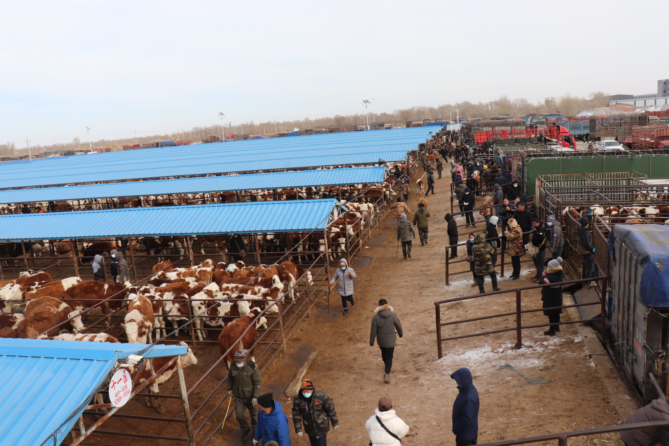 2000年ごろ、内モンゴル自治区では家畜定期市が定期市が成立し、とりわけウシの販売が盛んである。肉や乳製品の大量生産には高度な技術と衛生基準があるため、商品化しにくく、生体家畜を主要商品とする(内モンゴル自治区通遼市で撮影)。